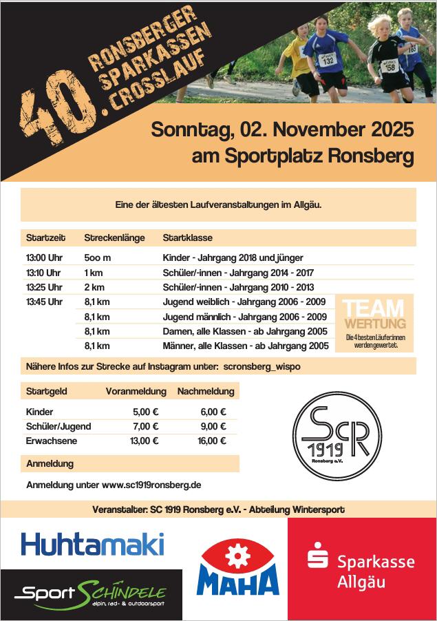 Am Sonntag, den 2. November 2025, fand am Sportplatz in Ronsberg der 40. Ronsberger Sparkassen Crosslauf um den Sport Schindele Pokal statt. Das diesjährige Jubiläum war ein besonderer Anlass: Seit der Gründung im Jahr 1985 durch die Wintersportabteilung rund um Johnny Seitz musste der Lauf nur ein einziges Mal – während der Pandemie – abgesagt werden. Schon bei der Premiere war das Interesse groß, wie ein Zeitungsartikel von damals belegt. Erwähnt wurden unter anderem Astrid Walser (Mutter des WM-Torschützen Mario Götze) und Klaus Schalk als schnellste Läufer. Auch viele andere Günztaler Persönlichkeiten, die zum Teil in ihrer Jugend hier starteten, werden genannt, darunter Michael Hofmann (Zimmerei), Jürgen Niederhofer (Autohaus), Joachim Schlaak (Heizungsbau), Christian Altthaler (Schreinerei), Wolfgang Glas, Jonny Seitz und Werner Bürgel vom SC Ronsberg sowie Jürgen Götze (Prof. Dr. für Datentechnik, Vater von Mario).